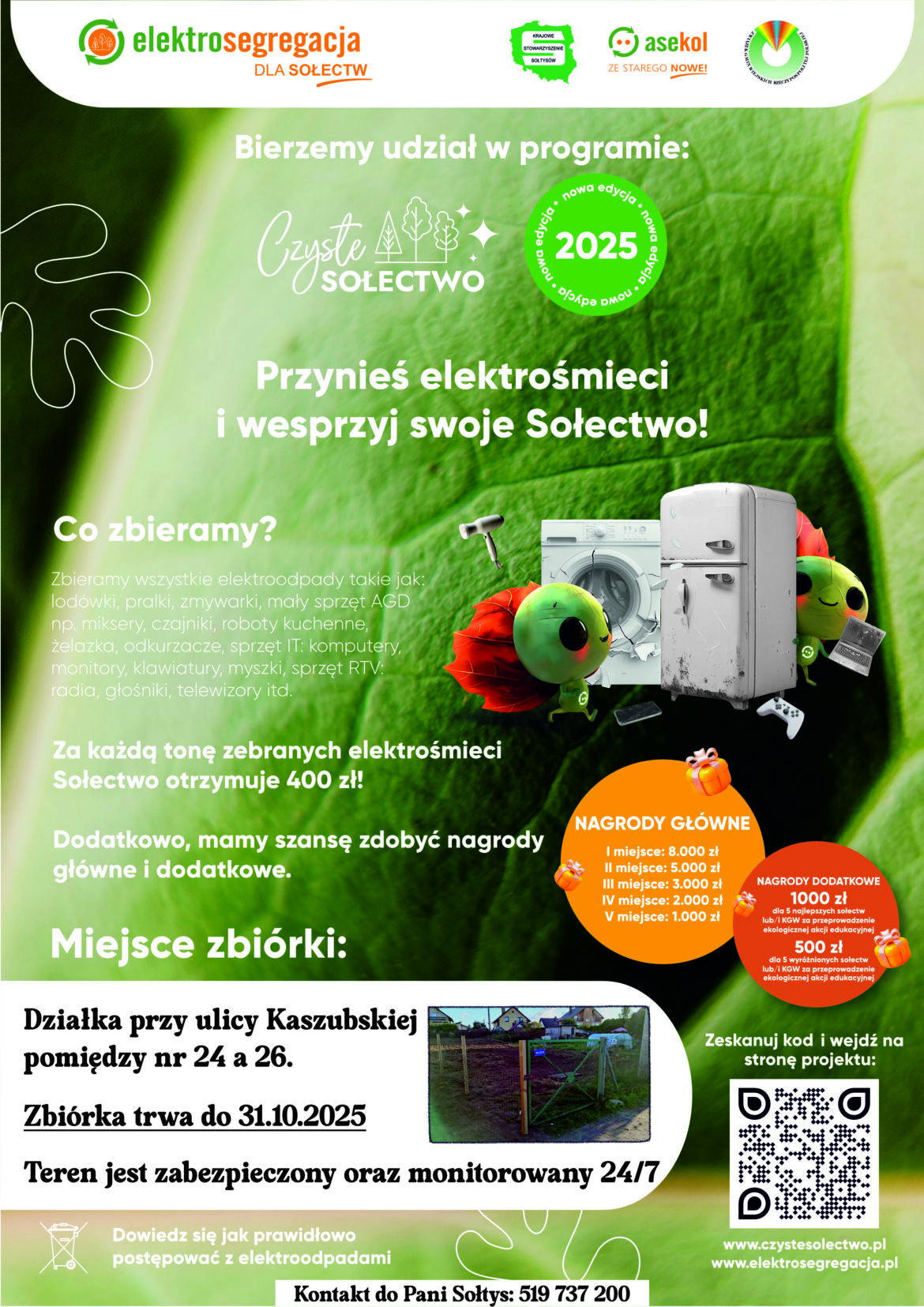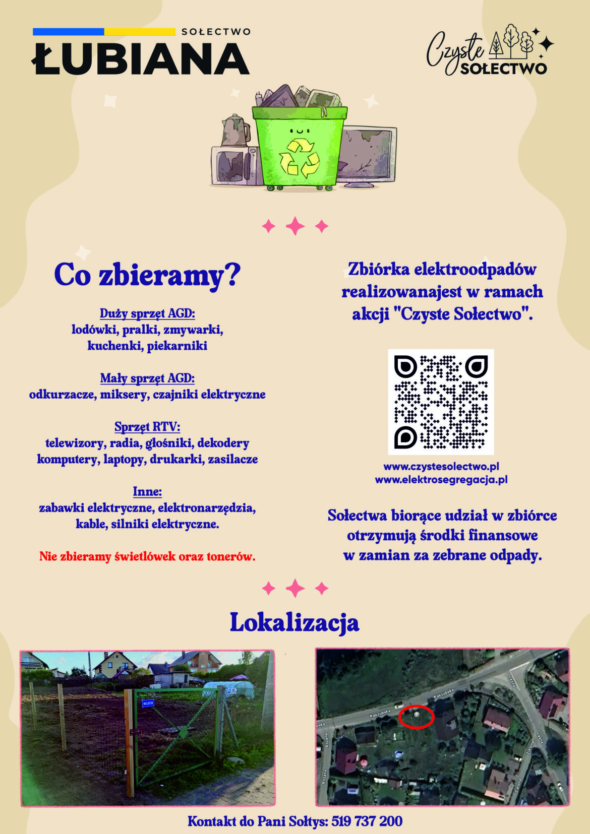 Łubiana ponownie dołącza do ogólnopolskiej inicjatywy „Czyste Sołectwo”! To doskonała okazja, aby pozbyć się zalegających w domach elektroodpadów, a jednocześnie zdobyć dodatkowe środki finansowe, które zostaną przeznaczone na potrzeby naszej miejscowości. Włączmy się wszyscy i wspólnie zadbajmy o czystość Łubiany!