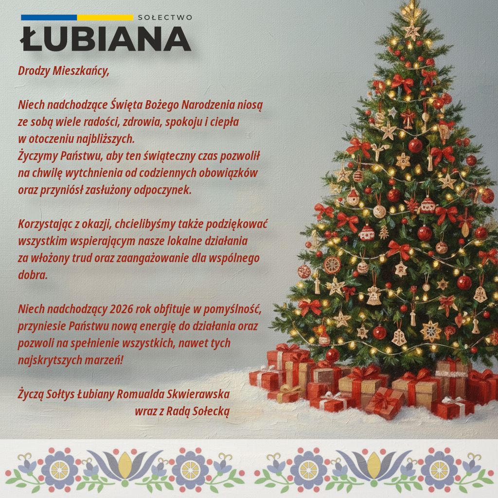 WażneŻyczenia Życzenia świąteczne przez admin 23/12/2025 Napisany przez: admin 23/12/2025 Bookmark 610 0 komentarze Facebook admin Follow Author poprzedni wpis Plan Kolęd 2025/2026 – aktualizacja następny wpis Ogłoszenia Parafialne – 28 grudnia 2025 You may also like Bookmark Podatek od nieruchomości – 2026 – I Rata 04/03/2026 Bookmark Łubiana w obszarze zagrożonym grypą ptaków (HPAI) 11/02/2026 Bookmark Zebranie Wiejskie – 02.02.2026 29/01/2026 Bookmark Powiat Kościerski: Informacja nt. zasad pełnienia dyżurów aptek... 26/01/2026 Bookmark Urząd Gminy: Podatek od nieruchomości – zmiana sposobu doręczeń... 25/01/2026 Bookmark Podsumowanie zbiórki elektroodpadów – Czyste Sołectwo 18/01/2026 Bookmark Poświąteczna zbiórka choinek 16/01/2026 Bookmark Ostrzeżenie przed nieuczciwym serwisem okien 04/01/2026 Bookmark Plan odbioru odpadów na rok 2026 30/11/2025 Bookmark (Nie)Łatwe wyrzucanie odpadów tekstylnych i ubrań 30/11/2025
