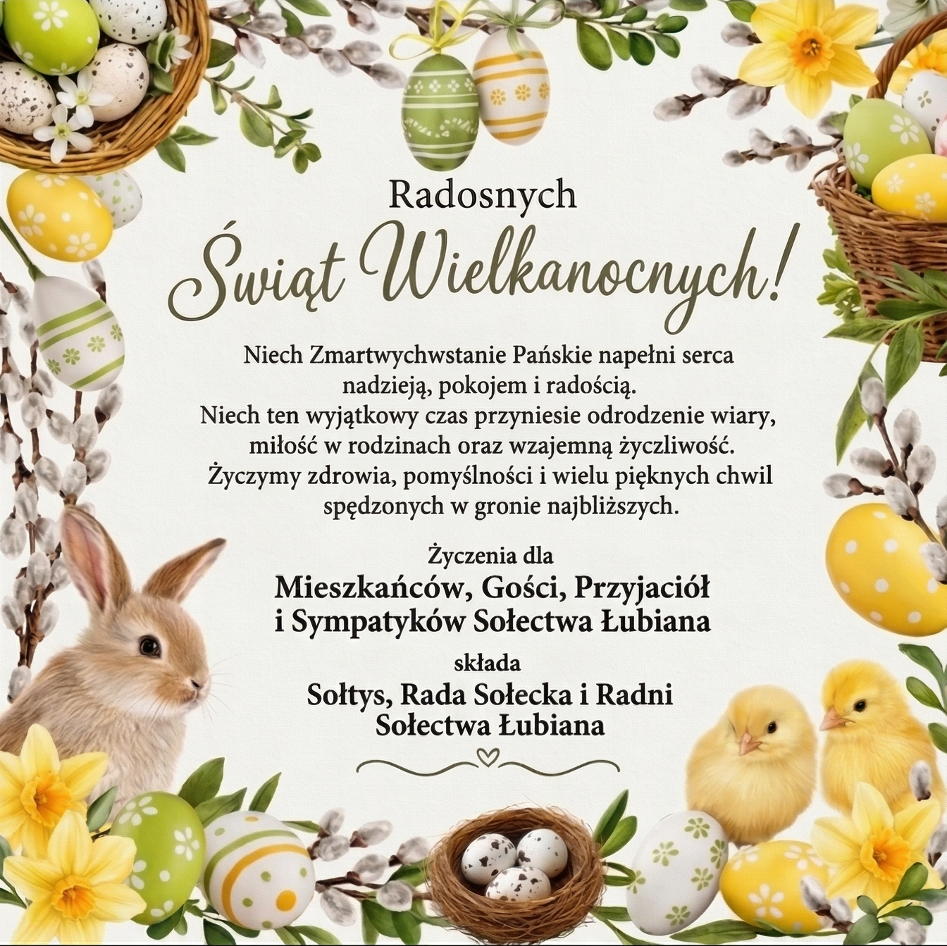 WażneŻyczenia Życzenia Wielkanocne przez admin 04/04/2026 Napisany przez: admin 04/04/2026 Bookmark 250 0 komentarze Facebook admin Follow Author poprzedni wpis Ogłoszenia Parafialne – 29 marca 2026 następny wpis Ogłoszenia Parafialne – 05 kwiecień 2026 You may also like Bookmark Gmina: Ogłoszenie o przystąpieniu do sporządzenia planu ogólnego... 11/04/2026 Bookmark Internet bez tajemnic – warsztaty cyfrowe! 07/04/2026 Bookmark Podatek od nieruchomości – 2026 – I Rata 04/03/2026 Bookmark Łubiana w obszarze zagrożonym grypą ptaków (HPAI) 11/02/2026 Bookmark Zebranie Wiejskie – 02.02.2026 29/01/2026 Bookmark Powiat Kościerski: Informacja nt. zasad pełnienia dyżurów aptek... 26/01/2026 Bookmark Urząd Gminy: Podatek od nieruchomości – zmiana sposobu doręczeń... 25/01/2026 Bookmark Podsumowanie zbiórki elektroodpadów – Czyste Sołectwo 18/01/2026 Bookmark Poświąteczna zbiórka choinek 16/01/2026 Bookmark Ostrzeżenie przed nieuczciwym serwisem okien 04/01/2026